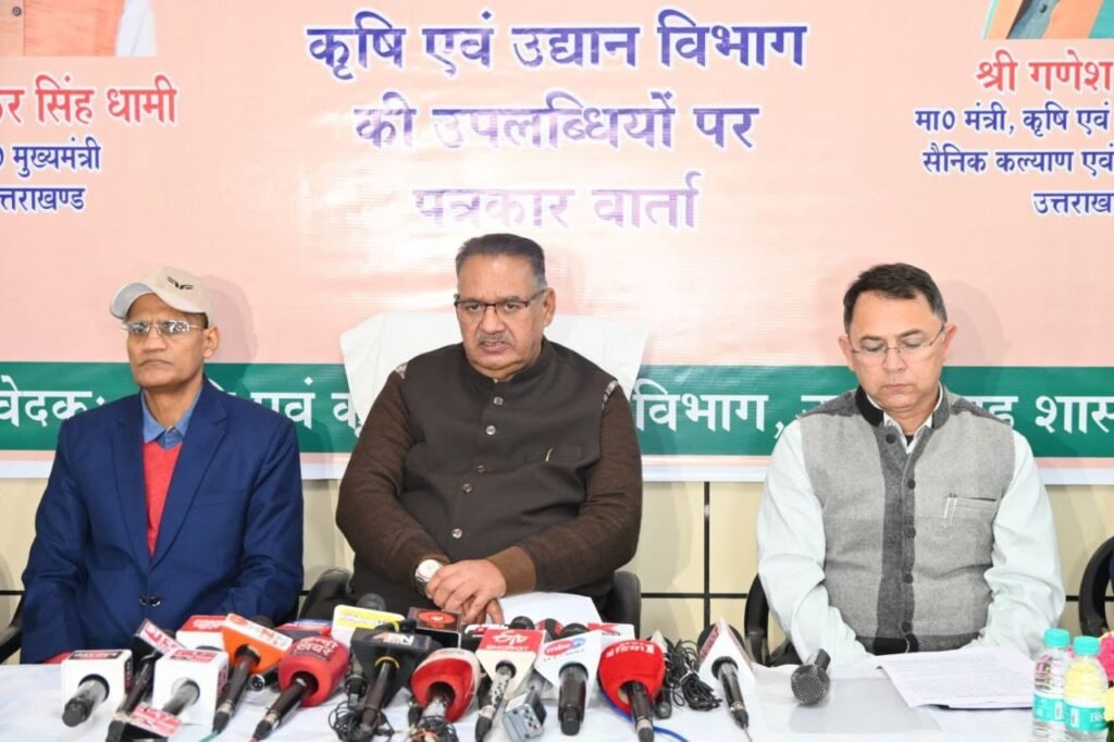 देहरादून, 13 फरवरी। कृषि मंत्री गणेश जोशी ने आज अपने कैंप कार्यालय में कृषि एवं उद्यान विभाग की उपलब्धियों के संबंध में प्रेस वार्ता की। इस दौरान कृषि एवं कृषक कल्याण मंत्री ने पत्रकारों को सम्बोधित करते हुए कहा कि किसानों की आय दोगुनी करने और उनकी आजीविका संवर्धन के लिए राज्य सरकार लगातार कार्य कर रही है। आजीविका बढ़ाने के लिए हरिद्वार तथा उधमसिंह नगर में अमृत सरोवर योजना के तहत बन रहे सरोवरों में मखाना की खेती को तथा सिंघाड़ा के उत्पादन को बढ़ाने के लिए आगामी बजट में व्यवस्था की गई और राज्य में फ्लोरीकल्चर को बढ़ावा दिया जा रहा है। उन्होंने कहा कि उत्तराखण्ड की कृषि जलवायु एवं भौगोलिक परिस्थितियों विभिन्न औद्यानिक फसलों (फल, सब्जी, मसाला, पुष्प, मशरूम तथा मौनपालन) के उत्पादन के लिए अत्यधिक अनुकूल है। विभाग द्वारा विभिन्न योजनाओं के अन्तर्गत इन फसलों के विकास के लिए व्यापक प्रयास किये जा रहे हैं।