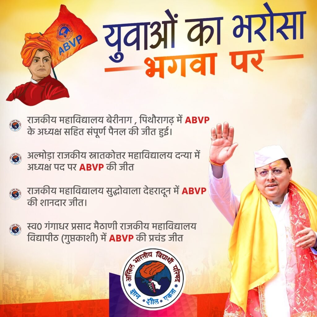 सीएम धामी के पारदर्शी नेतृत्व पर युवाओं का भरोसा, छात्रसंघ चुनावों में ABVP की ऐतिहासिक जीत